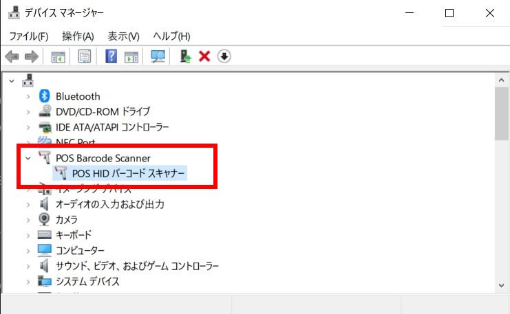 接続に成功すると、デバイスマネージャーの「POS Barcode Scanner」ノード(node)に「POS HID バーコードスキャナー」として表示されます。