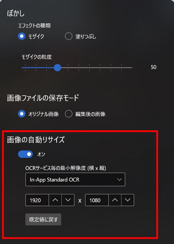 自動リサイズ機能を無効にしたい場合は、スイッチをOFFにして下さい。